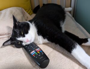 ちなみにもちは、けりぐるみや爪とぎなどにも顎をのせて寛いでいます。喉をナデナデしていたら、そのまま手に顎をのせてというかゆだねてきます(笑)あ、あと、リモコンにも顎をのせていたことがありましたね。ともかく、リラックスしているという証拠ですから、どこに顎をのせていてもほっこりとします。